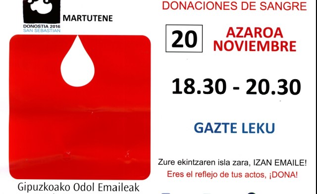 Archivado en Aisialdia/Ocio, Auzobizitza/Vida de barrio, Bizilagunak/Ciudadanos, Ekintzak/Actividades, Eragile sozialak/Agentes Sociales, Etxarriene, Iragarkiak/Anuncios, Partaidetza/Participación, Udaletxea/Ayuntamiento, Zerbitzuak/Servicios · Tagged with auzoa, azaroa, barrio, Donantes, gaztelekua, Gipuzkoa, gotatanta, martutene, noviembre, odol emaileak, odola, sangre