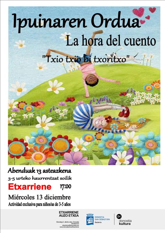 Archivado en Aisialdia/Ocio, Auzobizitza/Vida de barrio, Bizilagunak/Ciudadanos, Ekintzak/Actividades, Eragile sozialak/Agentes Sociales, Etxarriene, Iragarkiak/Anuncios, Partaidetza/Participación, Udaletxea/Ayuntamiento, Zerbitzuak/Servicios · Tagged with asteazkena, auzoa, barrio, cuento, cultura, etxarriene, haurra, ipuina, kultura, martutene, miércoles, niñas, niños