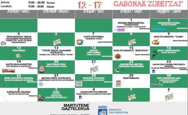 Archivado en Aisialdia/Ocio, Auzobizitza/Vida de barrio, Bizilagunak/Ciudadanos, Ekintzak/Actividades, Eragile sozialak/Agentes Sociales, Etxarriene, Gazteleku, Iragarkiak/Anuncios, Partaidetza/Participación, Udaletxea/Ayuntamiento, Zerbitzuak/Servicios · Tagged with abendua, actividades, diciembre, ekintzak, gabonak, gazteak, gaztelekua, hilabetea, jóvenes, larunbata, mes, navidad, programa, sábado, semana