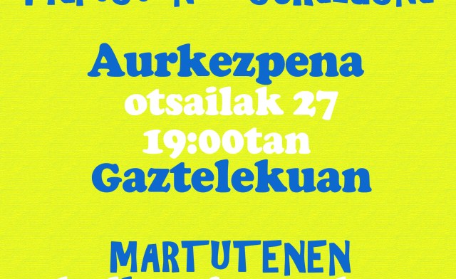 Archivado en Aisialdia/Ocio, Auzobizitza/Vida de barrio, Bizilagunak/Ciudadanos, Ekintzak/Actividades, Eragile sozialak/Agentes Sociales, Etxarriene, Gazteleku, Iragarkiak/Anuncios, Partaidetza/Participación, Udaletxea/Ayuntamiento, Zerbitzuak/Servicios · Tagged with aurkezpena, auzoa, ayuntamiento, barrio, euskara, gaztelekua, ikastola, martutene, presentación, udal etxea