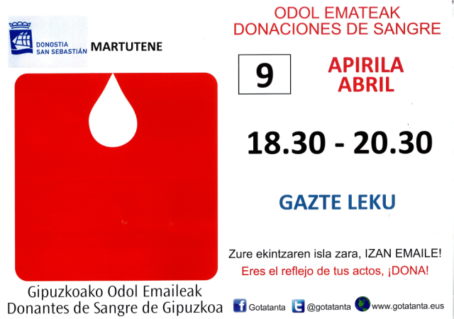 Archivado en Aisialdia/Ocio, Auzobizitza/Vida de barrio, Bizilagunak/Ciudadanos, Ekintzak/Actividades, Elkartasuna/Solidaridad, Eragile sozialak/Agentes Sociales, Etxarriene, Gazteleku, Iragarkiak/Anuncios, Partaidetza/Participación, Udaletxea/Ayuntamiento, Zerbitzuak/Servicios · Tagged with abril, apirila, donaciones, Donantes, etxarriene, gaztelekua, Gipuzkoa, gotatanta, martutene, odol emaileak, odol emateak