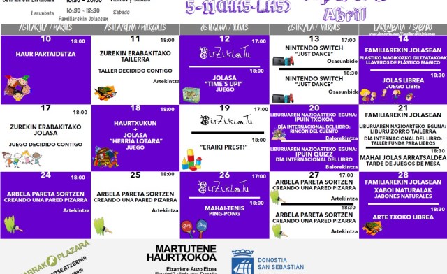 El Haurtxoko de Martutene, situado en Etxarriene, continuará con su programación de abril. Dentro de ella, esta semana l@s niñ@s de 5 a 11 años podrán participar en las siguientes actividades: