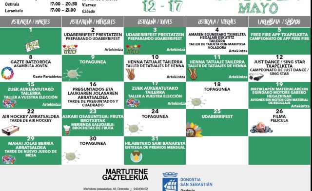 El Gazteleku de Martutene, comenzará con su programación de mayo. Dentro de ella, esta semana l@s adolescentes de 12 a 17 años podrán participar en las siguientes actividades: