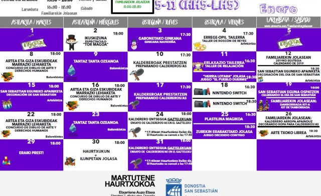 El Haurtxoko de Martutene, situado en Etxarriene, continuará con su programación de enero. Dentro de ella, esta semana l@s niñ@s de 5 a 11 años podrán participar en las siguientes actividades: