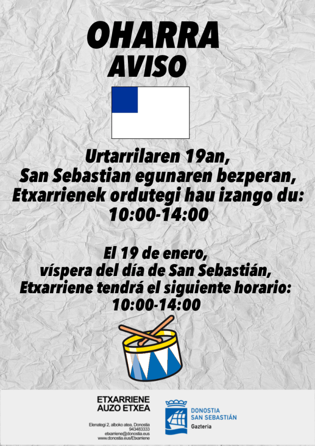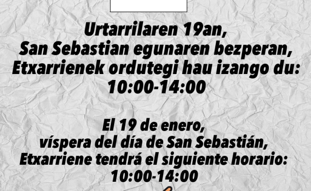Archivado en Aisialdia/Ocio, Auzobizitza/Vida de barrio, Bizilagunak/Ciudadanos, Ekintzak/Actividades, Eragile sozialak/Agentes Sociales, Etxarriene, Iragarkiak/Anuncios, Partaidetza/Participación, Udaletxea/Ayuntamiento, Zerbitzuak/Servicios · Tagged with aldaketa, auzoa, barrio, bezpera, cambio, enero, etxarriene, goiza, horario, mañana, martutene, ordutegia, urtarrila, víspera