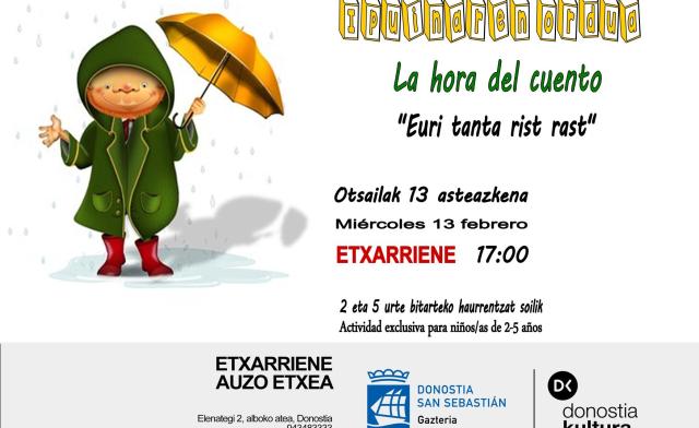 Archivado en Aisialdia/Ocio, Auzobizitza/Vida de barrio, Bizilagunak/Ciudadanos, Ekintzak/Actividades, Eragile sozialak/Agentes Sociales, Etxarriene, Iragarkiak/Anuncios, Partaidetza/Participación, Udaletxea/Ayuntamiento, Zerbitzuak/Servicios · Tagged with asteazkena, auzoa, barrio, bi, bost, cuento, cultura, donostia, etxarriene, febrero, haurrak, ipuina, kultura, martutene, miércoles, niñas, niños, otsaila, urte