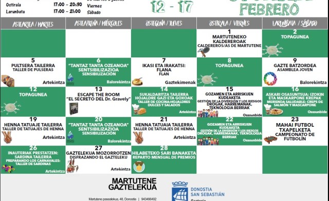 Martuteneko Gaztelekuak, otsaileko programaketarekin jarraituko du. Horren barne, aste honetan honako ekintzetan parte hartzeko aukera izango dute 12-17 urte bitarteko nerabeek: