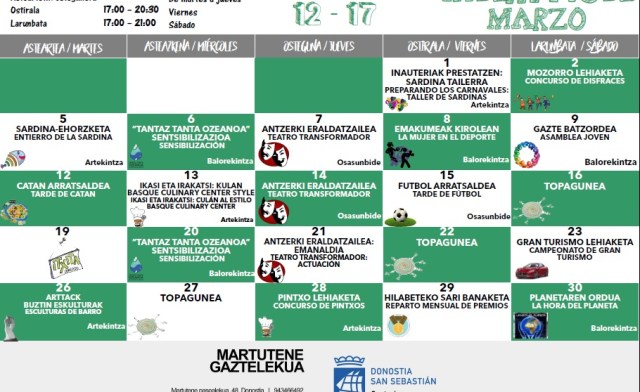 Archivado en Aisialdia/Ocio, Auzobizitza/Vida de barrio, Bizilagunak/Ciudadanos, Ekintzak/Actividades, Eragile sozialak/Agentes Sociales, Etxarriene, Gazteleku, Iragarkiak/Anuncios, Partaidetza/Participación, Udaletxea/Ayuntamiento, Zerbitzuak/Servicios · Tagged with actividades, astea, auzoa, barrio, carnaval, ekintzak, gazteak, gaztelekua, inauteriak, jóvenes, jolasa, juego, larunbata, martutene, martxoa, marzo, programa, programación, sábado, semana