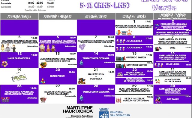 El Haurtxoko de Martutene, situado en Etxarriene, continuará con su programación de marzo. Dentro de ella, esta semana l@s niñ@s de 5 a 11 años podrán participar en las siguientes actividades: