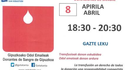 Archivado en Auzobizitza/Vida de barrio, Bizilagunak/Ciudadanos, Ekintzak/Actividades, Elkartasuna/Solidaridad, Eragile sozialak/Agentes Sociales, Etxarriene, Gazteleku, Iragarkiak/Anuncios · Tagged with 2019, abril, apirila, donación, donante, donostia, emaileak, martutene, odol emate, sangre
