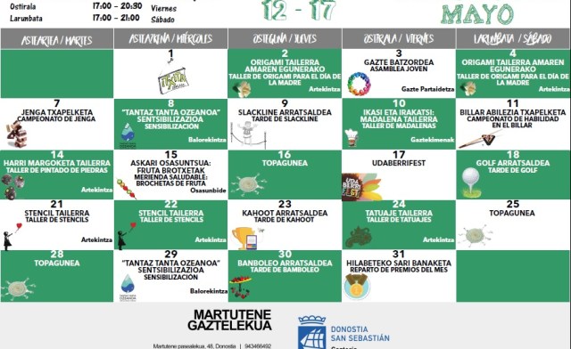 El Gazteleku de Martutene, continuará con su programación de mayo. Dentro de ella, esta semana l@s adolescentes de 12 a 17 años podrán participar en las siguientes actividades: