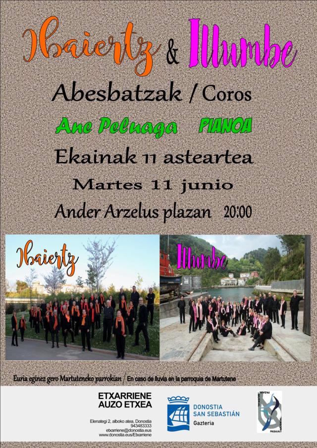 Archivado en Aisialdia/Ocio, Auzobizitza/Vida de barrio, Bizilagunak/Ciudadanos, Ekintzak/Actividades, Eragile sozialak/Agentes Sociales, Etxarriene, Iragarkiak/Anuncios, Partaidetza/Participación, Udaletxea/Ayuntamiento, Zerbitzuak/Servicios · Tagged with abesbatzak, ander, arzelus, asteartea, auzoa, barrio, CONCIERTO, coro, donostia, ekaina, eliza, eskola, Ibaiertz, illumbe, Iosu, junio, kontzertua, kultura, martes, martutene, musika, plaza, udara, verano