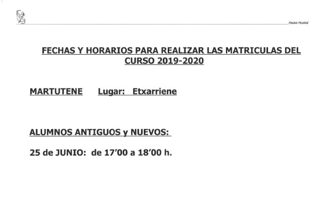 Gogoratu!!! Gaur Pasaia Musika Eskolako matrikulak / ¡¡Recuerda!! Hoy Matrículas Escuela Música Pasaia
