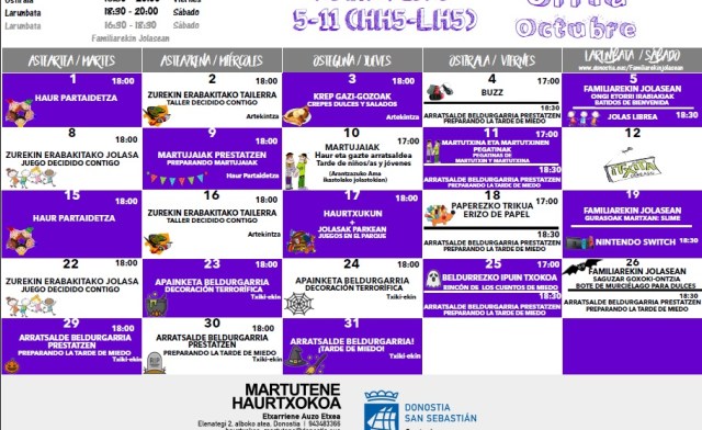 El Haurtxoko de Martutene, situado en Etxarriene, comenzará con su programación de octubre. Dentro de ella, esta semana l@s niñ@s de 5 a 11 años podrán participar en las siguientes actividades: