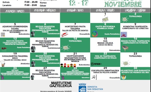 El Gazteleku de Martutene, continuará con su programación de noviembre. Dentro de ella, esta semana l@s adolescentes de 12 a 17 años podrán participar en las siguientes actividades: