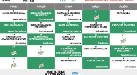Archivado en Aisialdia/Ocio, Auzobizitza/Vida de barrio, Bizilagunak/Ciudadanos, Ekintzak/Actividades, Eragile sozialak/Agentes Sociales, Etxarriene, Gazteleku, Iragarkiak/Anuncios, Partaidetza/Participación, Udaletxea/Ayuntamiento, Zerbitzuak/Servicios · Tagged with abendua, actividades, auzoa, barrio, cerrado, diciembre, ekintzak, enero, gazteak, gaztelekua, itxita, jóvenes, martutene, programación, programaketa, urtarrila