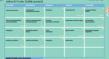 Martuteneko Gaztelekuak, urtarrileko programaketarekin jarraituko du. Horren barne, aste honetan honako ekintzetan parte hartzeko aukera izango dute 12-17 urte bitarteko nerabeek: Urtarrilak 28 asteartea: Artekintza: Graffiti mural tailerra Urtarrilak 29 asteazkena: Artekintza: Graffiti mural tailerra Urtarrilak 30 osteguna: Topagunea Urtarrilak 31 ostirala: Kaldereroak Otsailak 1 larunbata: Topagunea ——————————————————– El Gazteleku de Martutene, continuará con su … Seguir leyendo →