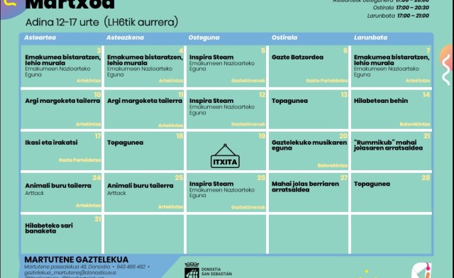 Martuteneko Gaztelekuak, martxoko programaketarekin hasiko da. Horren barne, aste honetan honako ekintzetan parte hartzeko aukera izango dute 12-17 urte bitarteko nerabeek: