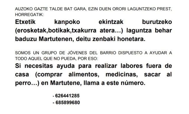 Archivado en Auzobizitza/Vida de barrio, Bizilagunak/Ciudadanos, Ekintzak/Actividades, Elkartasuna/Solidaridad, Gertaerak/Sucesos, Iragarkiak/Anuncios, Zerbitzuak/Servicios · Tagged with 19, ayuda, coronavirus, covid, donostia, elkartasuna, gazteak, jóvenes, koronabirusa, laguntza, martutene, solidaridad, taldea