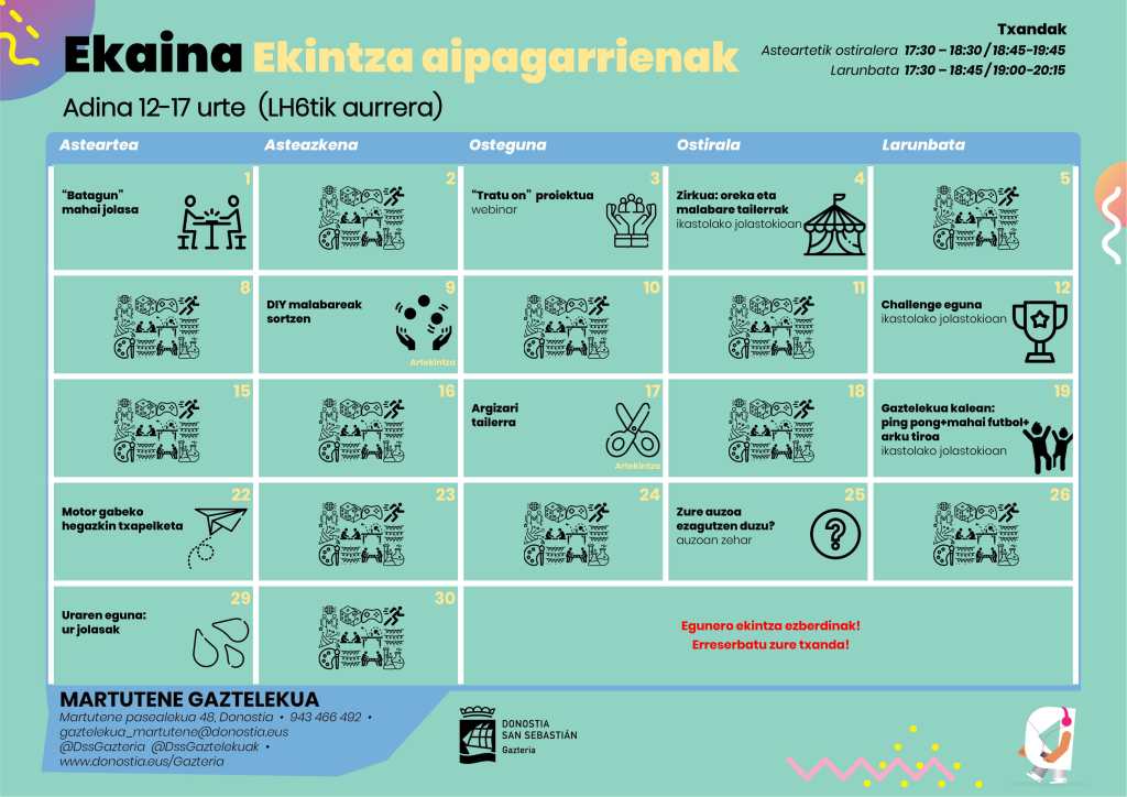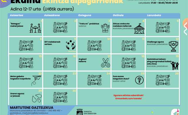 Archivado en Aisialdia/Ocio, Auzobizitza/Vida de barrio, Bizilagunak/Ciudadanos, Ekintzak/Actividades, Eragile sozialak/Agentes Sociales, Etxarriene, Gazteleku, Partaidetza/Participación, Zerbitzuak/Servicios · Tagged with ekaina, gaztelekua, junio, martutene, programación, programaketa, programazioa