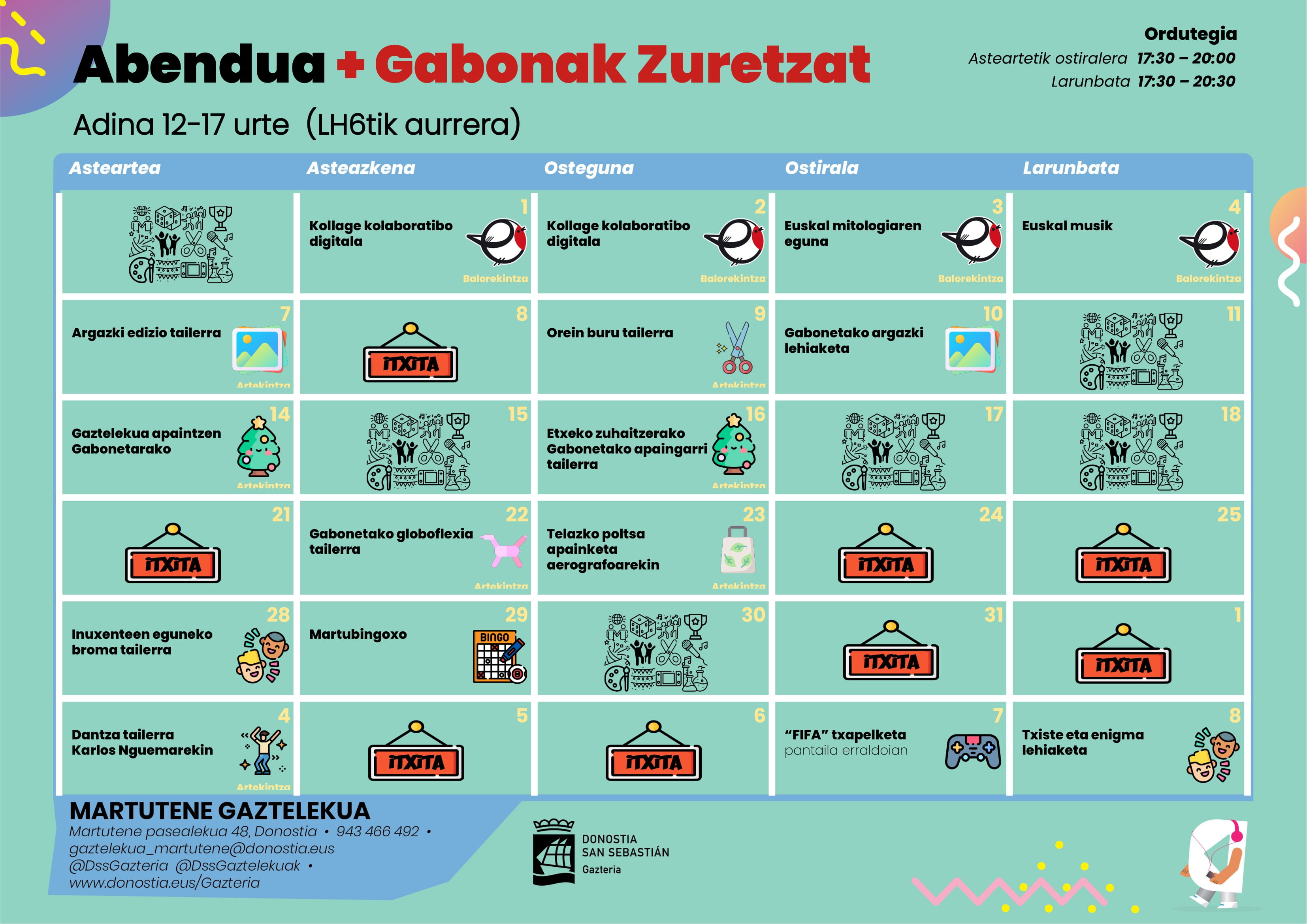 Archivado en Aisialdia/Ocio, Auzobizitza/Vida de barrio, Bizilagunak/Ciudadanos, Eragile sozialak/Agentes Sociales, Etxarriene, Gazteleku, Zerbitzuak/Servicios · Tagged with abendua, diciembre, gabonak, gazteleku, gaztelekua, martutene, navidad, navidades, programación, programaketa, programazioa, zuretzat