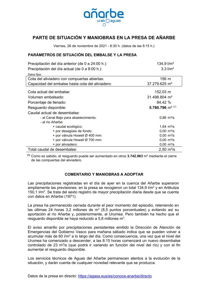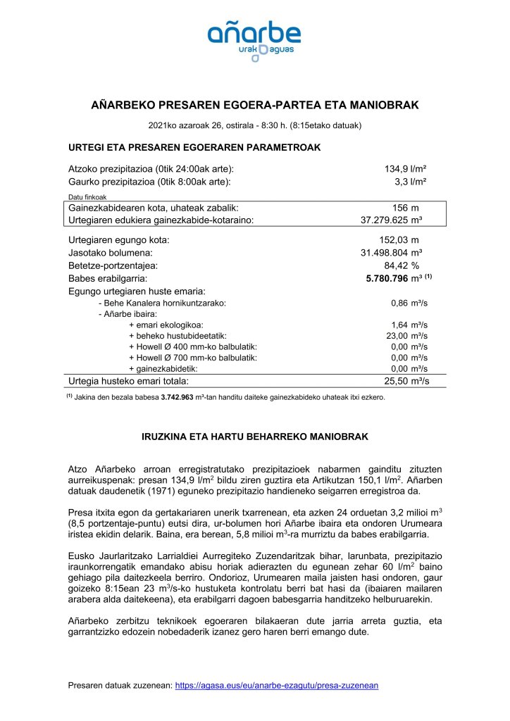 Añarbeko presaren egoera-partea eta maniobrak / Parte de situación y maniobras de la presa de Añarbe
