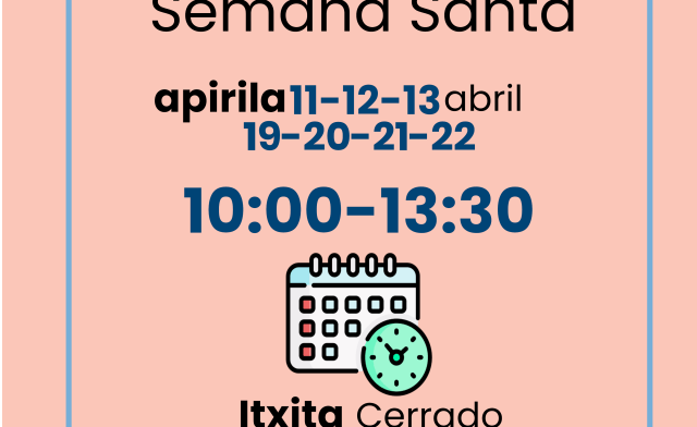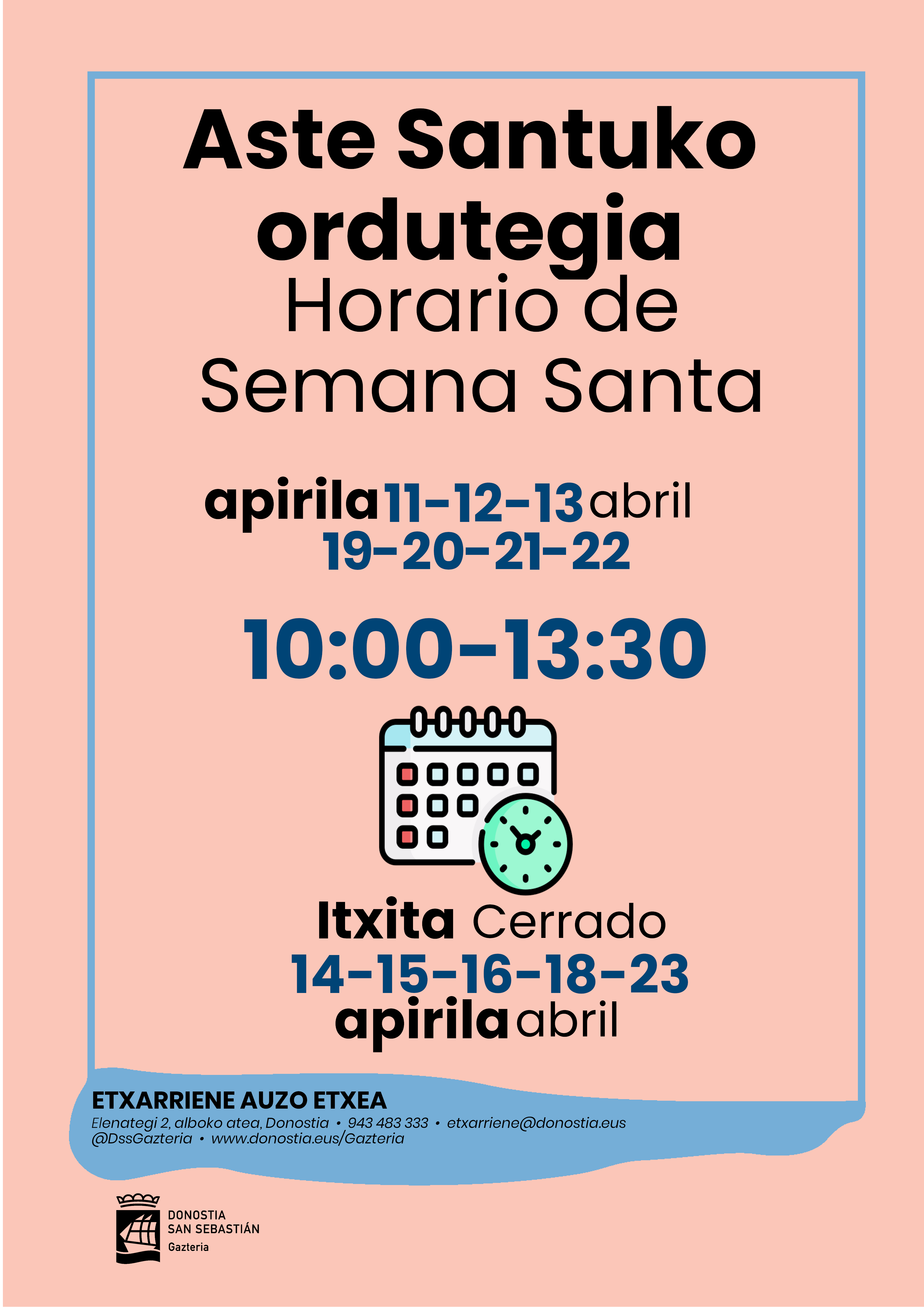 Archivado en Aisialdia/Ocio, Auzobizitza/Vida de barrio, Bizilagunak/Ciudadanos, Eragile sozialak/Agentes Sociales, Etxarriene · Tagged with 2022, aste santua, etxarriene, horario, martutene, ordutegia, pazko astea, semana de pascua, semana santa