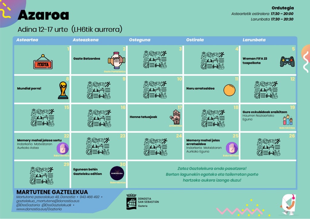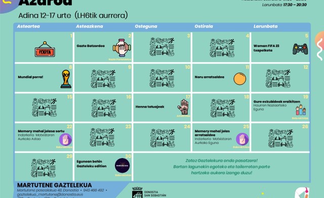 Archivado en Aisialdia/Ocio, Auzobizitza/Vida de barrio, Eragile sozialak/Agentes Sociales, Gazteleku, Zerbitzuak/Servicios · Tagged with adolescentes, auzoa, barrio, gazteak, gaztelekua, joven, martutene, nerabeak, programación, programaketa