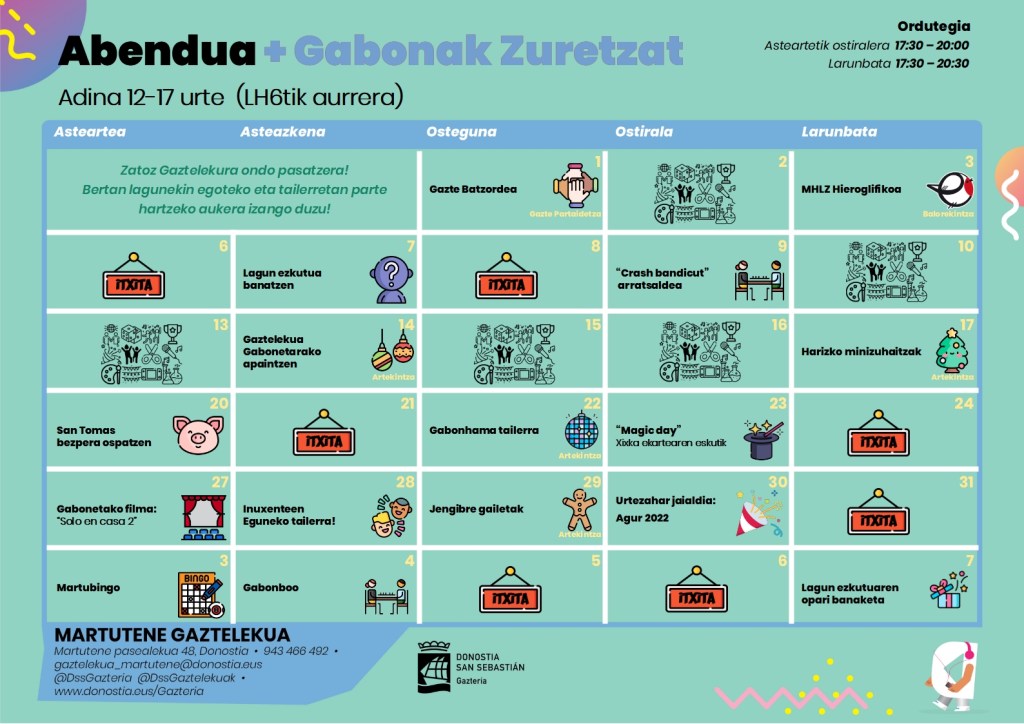 Archivado en Aisialdia/Ocio, Auzobizitza/Vida de barrio, Gazteleku, Zerbitzuak/Servicios · Tagged with abendua, adolescentes, auzoa, barrio, diciembre, donostia, gaztelekua, JOVENES, martutene, nerabeak, programación, programaketa