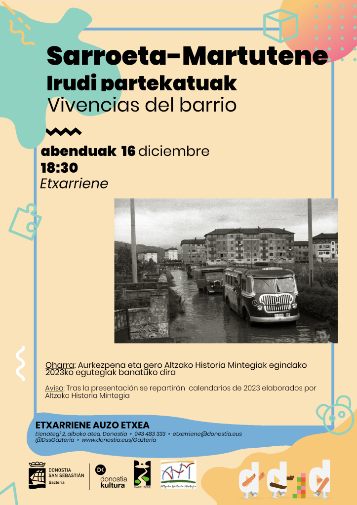 El día 16 de diciembre, viernes, se hará la presentación de la exposición de fotos «Sarroeta-Martutene: Vivencias de barrio» en el Centro Cívico Etxarriene. Tras la presentación se repartirán calendarios de 2023 elaborados por Altzako Historia Mintegia