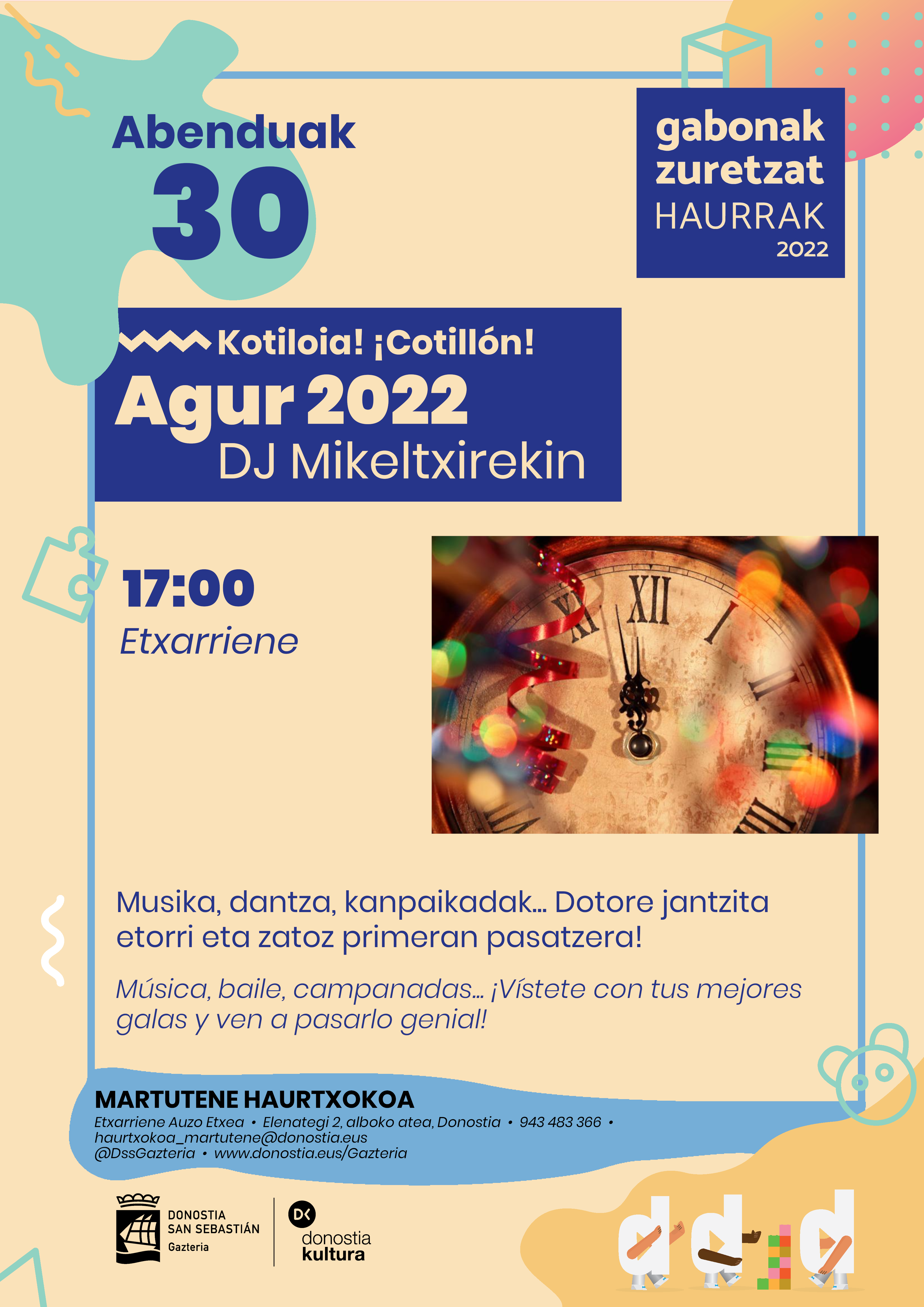 Archivado en Aisialdia/Ocio, Ekintzak/Actividades, Etxarriene, Haurtxoko, Kultura/Cultura, Musika/Música, Zerbitzuak/Servicios · Tagged with baile, cotillón, dantza, etxarriene, haurrak, kotiloia, martutene, musica, musika, niñas, niños