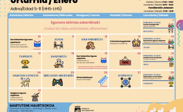 Archivado en Aisialdia/Ocio, Auzobizitza/Vida de barrio, Ekintzak/Actividades, Haurtxoko, Zerbitzuak/Servicios · Tagged with auzoa, barrio, donostia, enero, etxarriene, haurrak, martutene, niñas, niños, programación, programaketa, urtarrila
