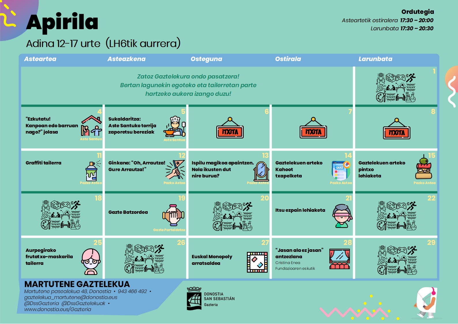 Archivado en Aisialdia/Ocio, Gazteleku, Zerbitzuak/Servicios · Tagged with adolescentes, auzoa, barrio, donostia, gaztelekua, martutene, martutene gaztelekua, nerabeak, programación, programaketa