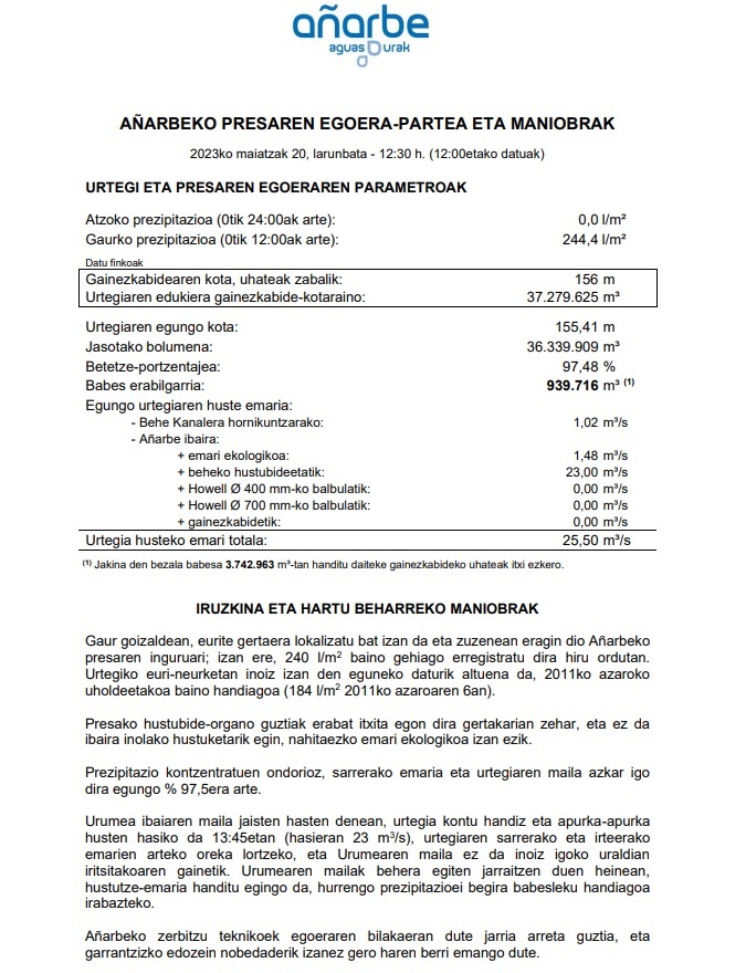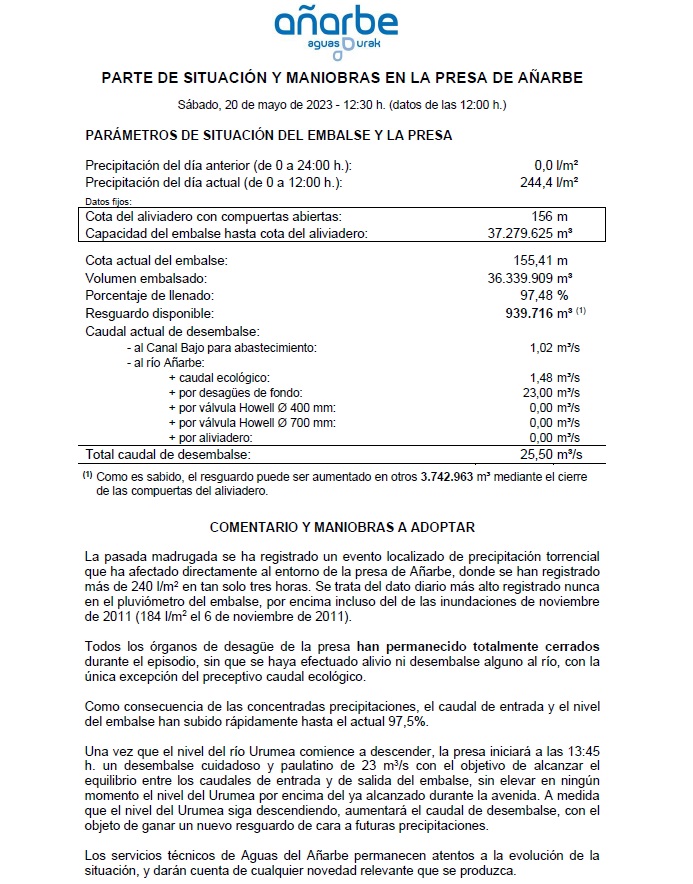 Añarbeko presaren egoera-partea eta maniobrak/ Parte de situación y maniobras en la presa de Añarbe