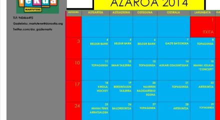 Archivado en Aisialdia/Ocio, Auzobizitza/Vida de barrio, Bizilagunak/Ciudadanos, Ekintzak/Actividades, Eragile sozialak/Agentes Sociales, Etxarriene, Gazteleku, Iragarkiak/Anuncios, Partaidetza/Participación, Udaletxea/Ayuntamiento, Zerbitzuak/Servicios · Tagged with 2014, azaroa, etxarriene, gazteleku, martutene, noviembre, programación, programaketa