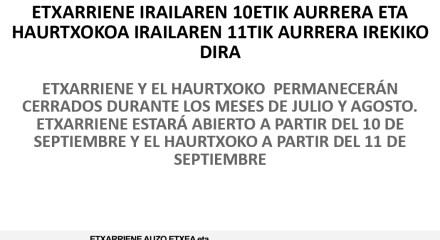 Etxarriene eta Haurtxokoa uztailean eta abuztuan itxita egongo dira. Etxarriene y el Haurtxoko permanecerán cerrados en julio y agosto.