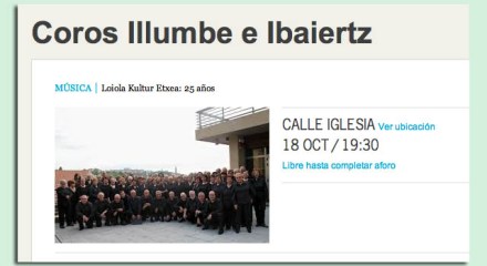 Tras la actuación en fiestas de Martutene, el coro Ibaiertz, junto al coro Illumbe, actuará esta tarde en la calle de la Iglesia de Loiola a las 19:30h. Es libre hasta completar aforo. http://www.donostiakultura.com/index.php?option=com_flexicontent&view=items&cid=12&id=13888&Itemid=315&lang=es