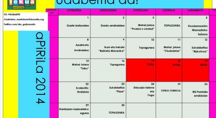 Archivado en Aisialdia/Ocio, Auzobizitza/Vida de barrio, Bizilagunak/Ciudadanos, Ekintzak/Actividades, Eragile sozialak/Agentes Sociales, Etxarriene, Iragarkiak/Anuncios, Partaidetza/Participación, Udaletxea/Ayuntamiento, Zerbitzuak/Servicios · Tagged with 2014, abril, adolescentes, apirila, etxarriene, gazteak, gazteleku, jóvenes, martutene, nerabeak, programación, programaketa