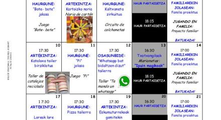 Martuteneko Haurtxokoak, Etxarrienen aurkitzen dena, ekaineko programaketarekin jarraituko du. Horren barne, aste honetan honako ekintzetan parte hartzeko aukera izango dute 6-12 urte bitarteko haurrek: Ekainak 10 asteartea: Artekintza: kataloxa tailer birtziklatua Ekainak 11 asteazkena: Pi jolasa Ekainak 12 osteguna: Osasunbide: «whatsapp bat bidaltzen dizut!» tailerra Ekainak 13 ostirala: Txotxongilo emanaldia: «Ipuin magikoak» Bihar taldea Ekainak 14 larunbata: Familiarekin Jolasean «Talde proiektua» ——————————————————– El Haurtxoko de Martutene, situado en Etxarriene, … Seguir leyendo →