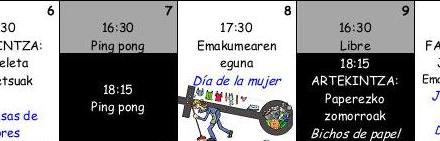 Archivado en Aisialdia/Ocio, Auzobizitza/Vida de barrio, Bizilagunak/Ciudadanos, Ekintzak/Actividades, Eragile sozialak/Agentes Sociales, Etxarriene, Iragarkiak/Anuncios, Partaidetza/Participación, Udaletxea/Ayuntamiento, Zerbitzuak/Servicios · Tagged with artekintza, color, día, eguna, emakume, etxarriene, familiarekin jolasean, haurrak, haurtxoko, joku, juego, jugando en familia, koloretsu, libre, mariposa, martutene, martxoa, marzo, mujer, niñas, niños, ping pong, programación, programaketa, tximeleta