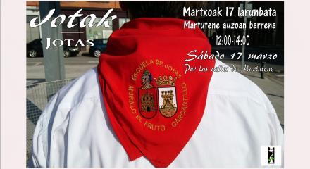 Archivado en Aisialdia/Ocio, Auzobizitza/Vida de barrio, Bizilagunak/Ciudadanos, Ekintzak/Actividades, Eragile sozialak/Agentes Sociales, Etxarriene, Iragarkiak/Anuncios, Partaidetza/Participación, Udaletxea/Ayuntamiento, Zerbitzuak/Servicios · Tagged with animación, animazioa, auzoa, barrio, jotak, jotas, larunbata, martuene, martxoa, marzo, Nafarroa, navarra, sábado