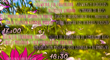 Archivado en Asociación Sarroeta auzo elkartea · Tagged with bicicleta, birziklatu, bizikleta, CC MARTUTENE, ecocilo, educo, ekozikloa, el pilar, etxarriene, gazteleku, haurtxoko, hezizerb, iker goenaga, margo, mural, olatu talka, poste verde, poster berdea, segway, sorginzulo, timbre, triki, Txapel Aundi, txirrina, udaberrifest