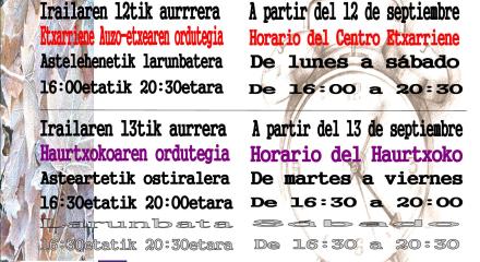 Udako oporren ondoren, iritsi da Etxarriene Auzo Etxeak, Martuteneko Haurtxokoak eta Gaztelekuak beraien ateak berriro irekitzeko momentua. Datorren astetik aurrera zerbitzu hauek martxan egongo dira berriro. Etxarriene: astelehenean, irailak 12 irekiko da. Ordutegia: astelehenetik larunbatera, 16:00-20:30. Haurtxokoa: asteartean, irailak 13 irekiko da. Ordutegia: asteartetik ostiralera, 16:30-20:00. Larunbatak, 16:30-20:30. Gaztelekua: asteartean, irailak 13 irekiko da. Ordutegia: … Seguir leyendo →