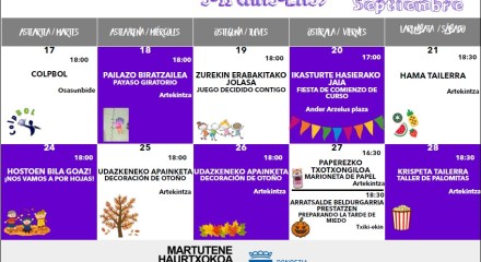 Martuteneko Haurtxokoak, Etxarrienen aurkitzen dena, iraileko programaketarekin jarraituko du. Horren barne, aste honetan honako ekintzetan parte hartzeko aukera izango dute 5-11 urte bitarteko haurrek: Irailak 24 asteartea: Hostoen bila goaz!! Irailak 25 asteazkena: Artekintza: Udazkeneko apainketa Irailak 26 osteguna: Artekintza: Udazkeneko apainketa Irailak 27 ostirala: Artekintza: Paperezko txotxongiloa / Txiki-ekin: Arratsalde beldurgarria prestatzen … Seguir leyendo →